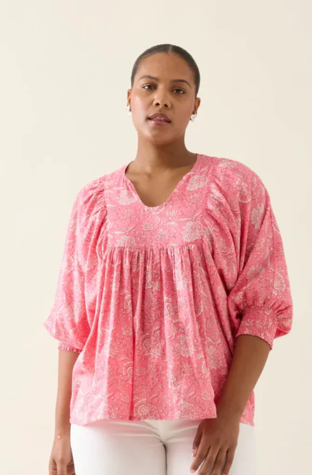 A colourful cotton voile piece with artisanal charm, inspired by floral hand-block. The Wilma Top is hand screen printed and features a soft front yoke, shirred 3/4 sleeves and a relaxed silhouette for everyday ease.