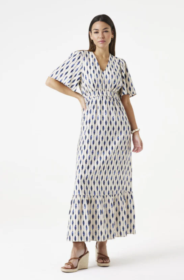 This dress has short sleeves, an elastic waistband, a V-neckline, and a regular fit.