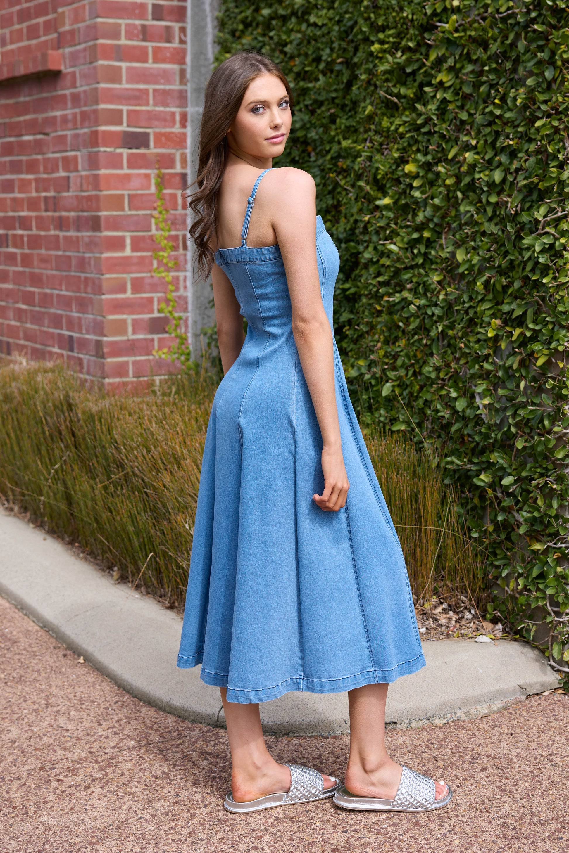 A soft denim midi dress with a flowy skirt.