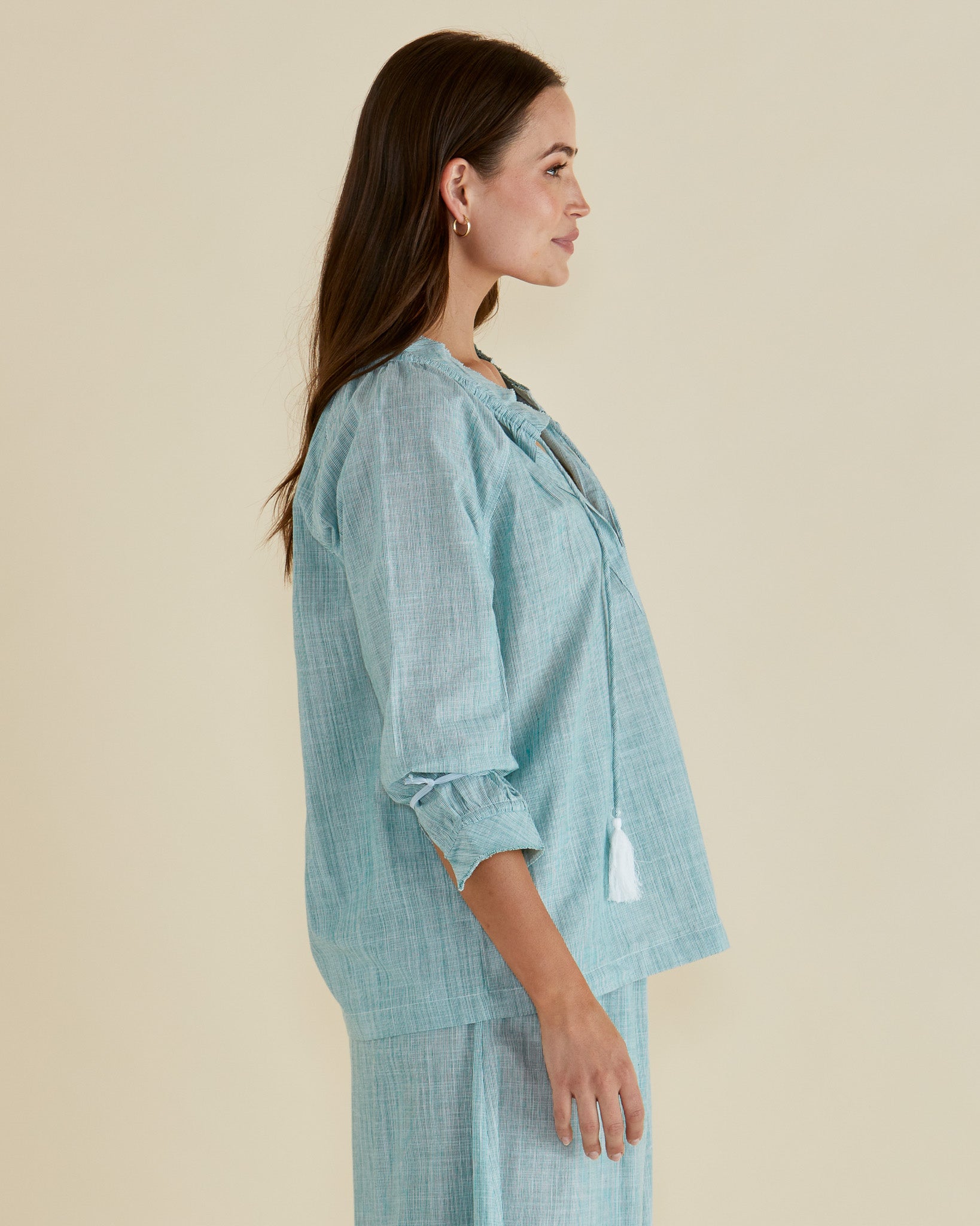 The Charli Blouse combines handwoven cotton with an open V-neckline and tie neck detail for an elevated silhouette. Raglan sleeves and relaxed fit add effortless comfort.
