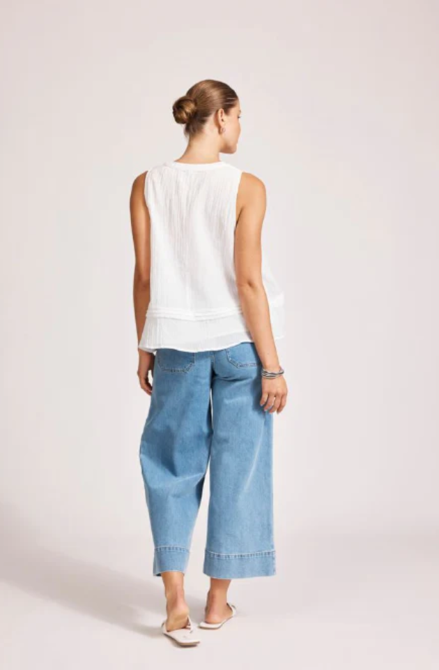 A versatile summer tank with soft texture and natural breathability. Crafted from a cotton-blend with a double-layered design for opacity. Features a flattering V neckline with pintuck detail and soft pleating at the hem.