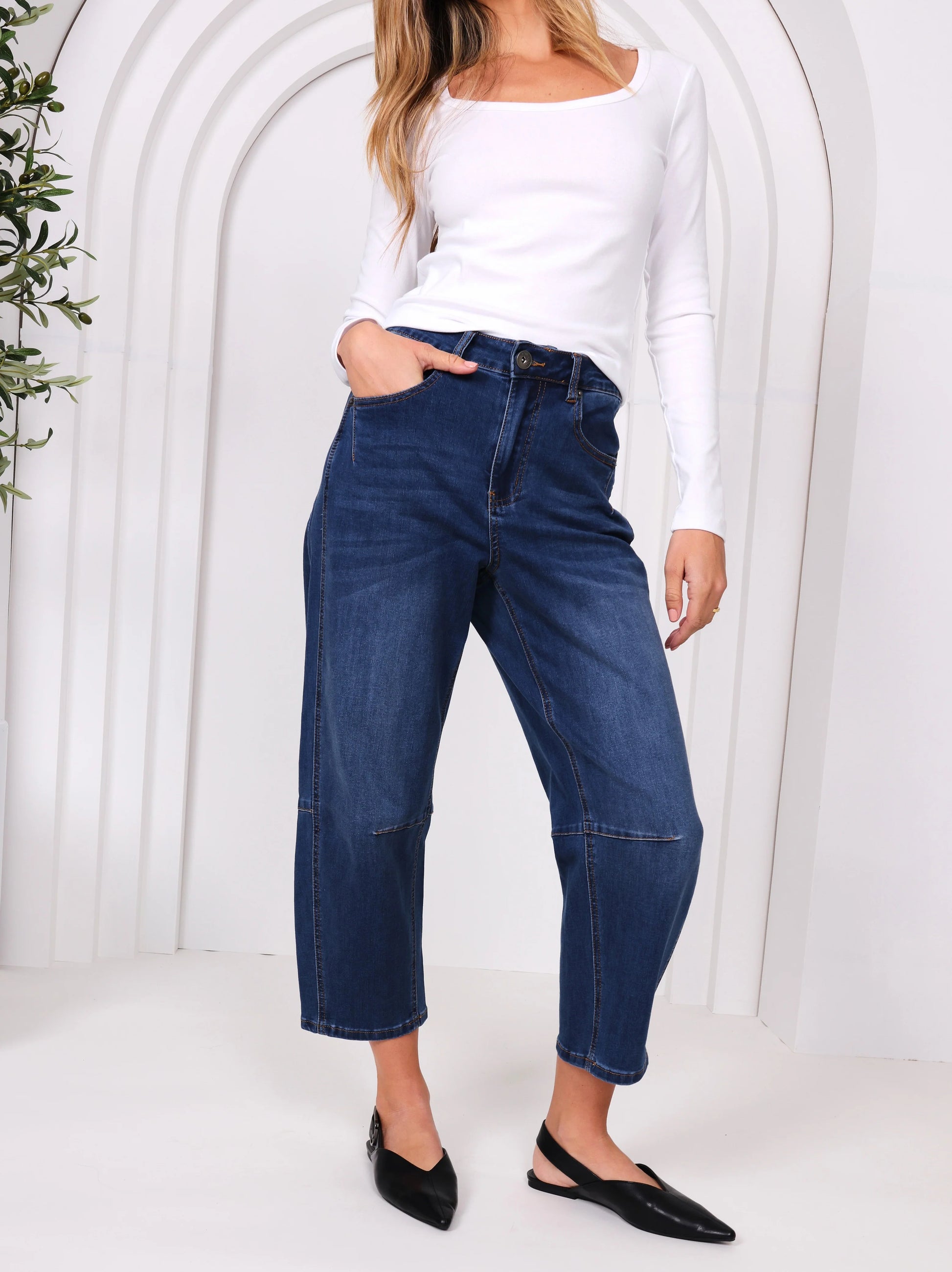 Characteristics of Toni Barrel-Leg Jeans include a fitted waist, flared-out shape around the mid-leg, and tapered silhouette at the bottom, which exudes the look of, well, a barrel.